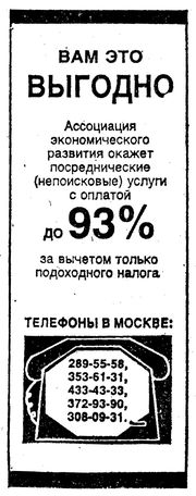 Ассоциация экономического развития окажет посреднические (непоисковые) услуги с оплатой до 93% за вычетом только подоходного налога.